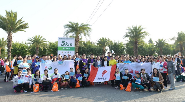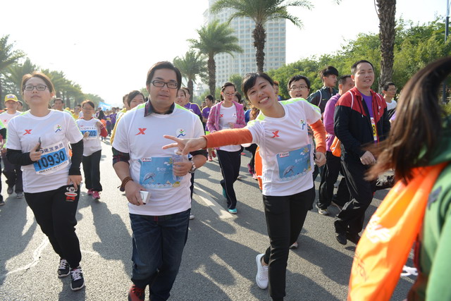 盡管冬日清晨有些凍人,但這絲毫沒有“凍”壞象嶼人的熱情。一進入賽場,大家就摩拳擦掌,躍躍欲試。今年的馬拉松對象嶼跑團而言,有著特殊的意義,這不僅是一場健康跑,更是一場公益跑。此次比賽跑道恰好與火燒嶼隔海相望,由集團捐資建立的中華白海豚救護繁育基地正坐落島上。白海豚的可愛形象也隨之出現(xiàn)在象嶼“跑男”“跑女”的前胸、后背。公益旗幟、白海豚公益宣傳貼紙,紅帆logo,以及我們朝氣蓬勃的象嶼跑團組成了一道“有愛”的風景線。這也吸引了周圍許多馬拉松參賽者的目光,有的參賽者甚至圍上前來詢問是否也能加入其中。于是,象嶼救助白海豚的公益之舉隨著象嶼人的奔跑也一路傳播開來。