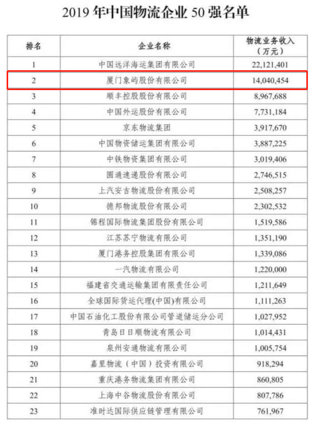 今日,中國物流與采購聯(lián)合會公布了2019年度中國物流企業(yè)50強(qiáng)排名,象嶼股份蟬聯(lián)第2。