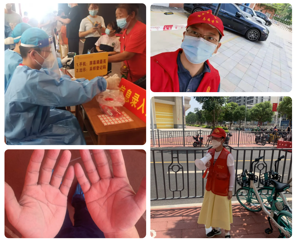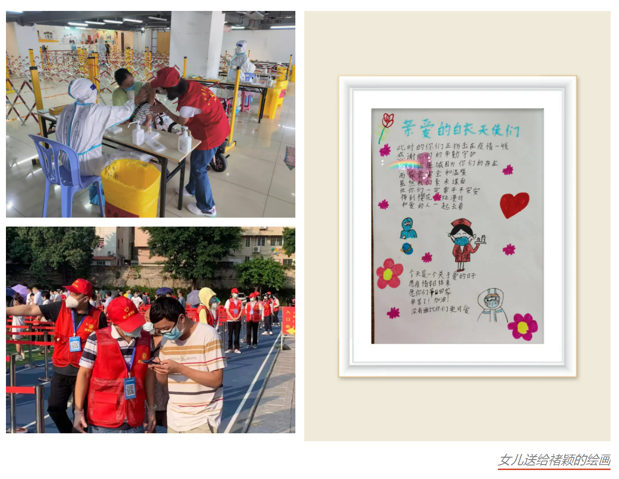 來自象嶼速傳黨辦的禇穎與她愛人更是雙方齊上陣,兩人錯(cuò)開時(shí)間進(jìn)行志愿服務(wù),一人在外幫助市民進(jìn)行核酸檢測(cè),一人在家照顧孩子,既顧好“小家”也顧著“大家”。當(dāng)她完成志愿者任務(wù),給女兒看了自己的照片后,女兒忽閃忽閃的大眼睛直直地看著媽媽說:“媽媽,真不容易,應(yīng)該很熱吧!”夫妻二人用親身經(jīng)歷給孩子樹立了一個(gè)好榜樣!