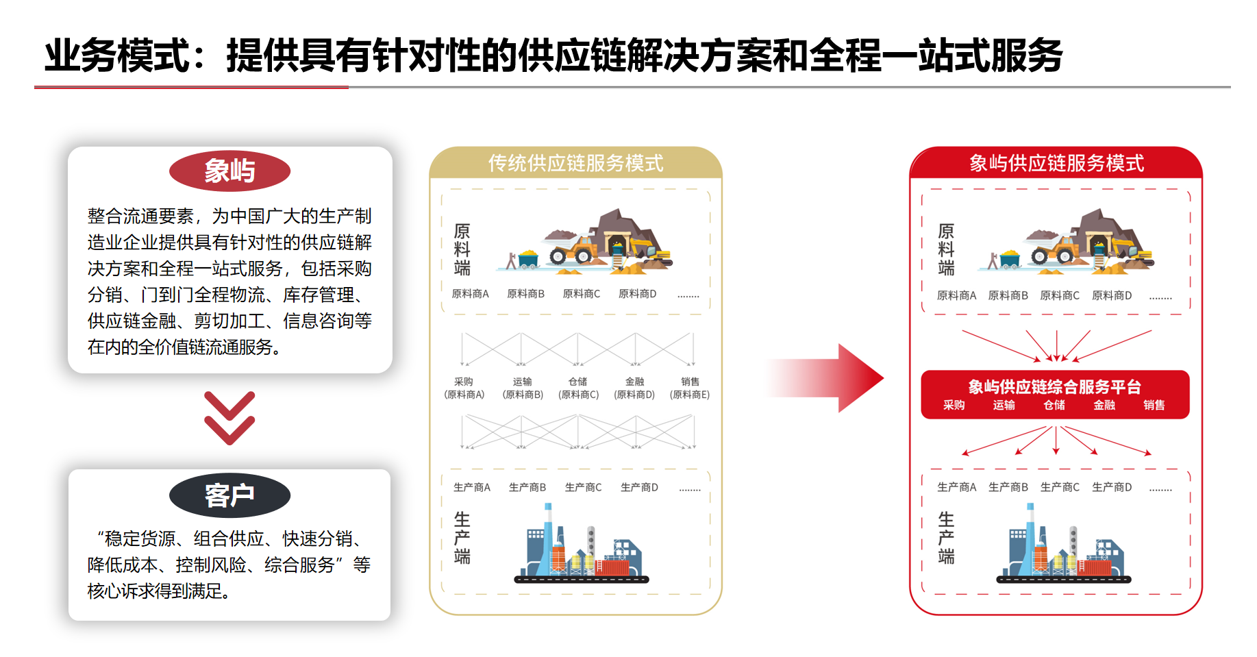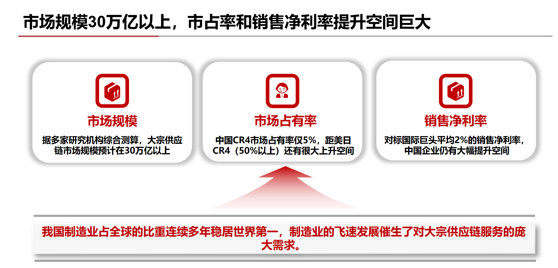 制造業(yè)企業(yè)日益專(zhuān)業(yè)化,對(duì)供應(yīng)鏈服務(wù)的需求從簡(jiǎn)單追求成本,轉(zhuǎn)變?yōu)楦非笮?,市?chǎng)亟需能提供“一攬子”服務(wù)、具備效率優(yōu)勢(shì)的大宗供應(yīng)鏈服務(wù)商。