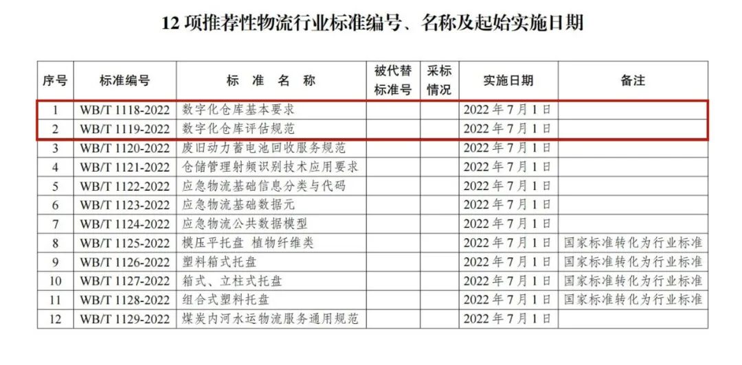 近日,中華人民共和國(guó)國(guó)家發(fā)展和改革委員會(huì)印發(fā)了2022年第6號(hào)公告,批準(zhǔn)發(fā)布12項(xiàng)推薦性物流行業(yè)標(biāo)準(zhǔn)。其中,由廈門象嶼股份有限公司參與編寫的《數(shù)字化倉(cāng)庫(kù)基本要求》(WB/T 1118-2022)《數(shù)字化倉(cāng)庫(kù)評(píng)估規(guī)范》(WB/T 1119-2022)2項(xiàng)推薦性物流行業(yè)標(biāo)準(zhǔn)于2022年7月1日正式實(shí)施。