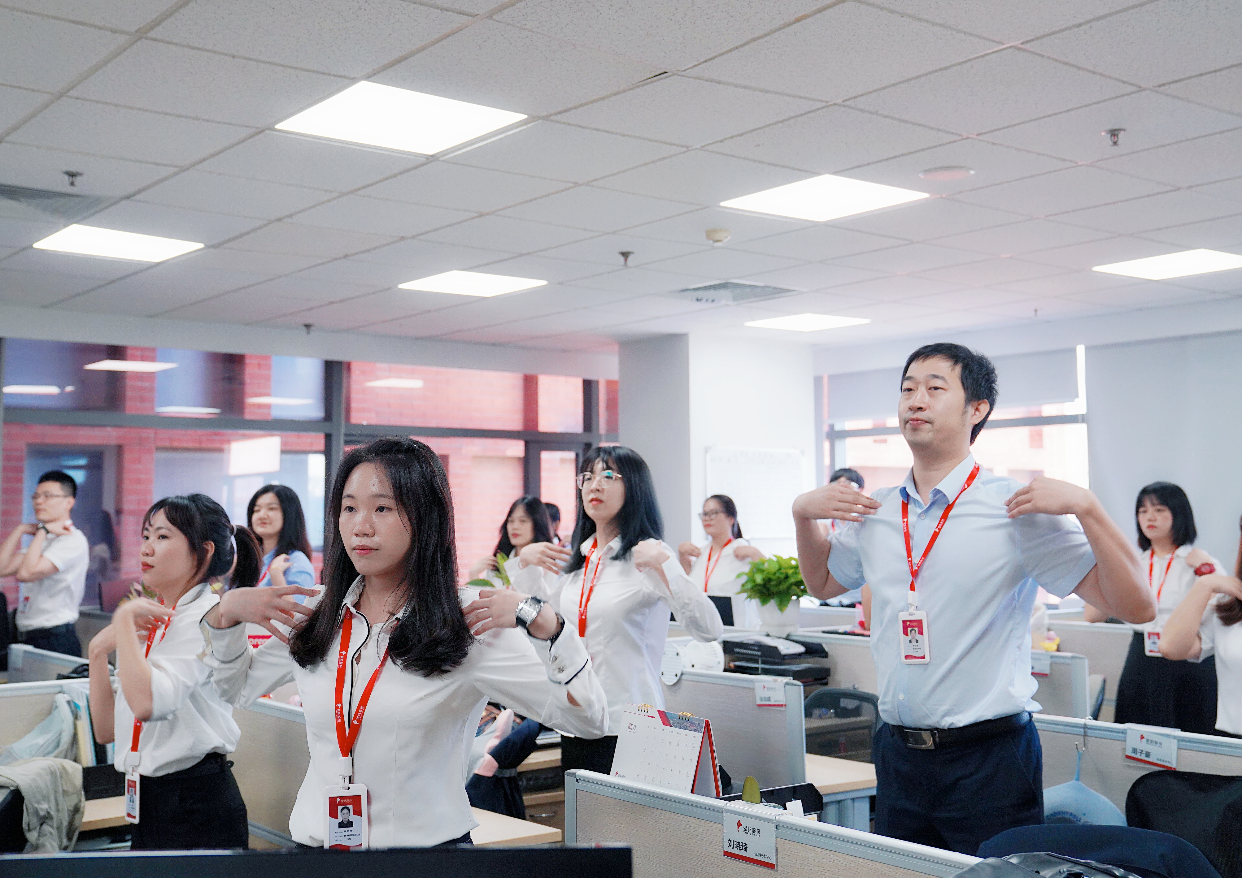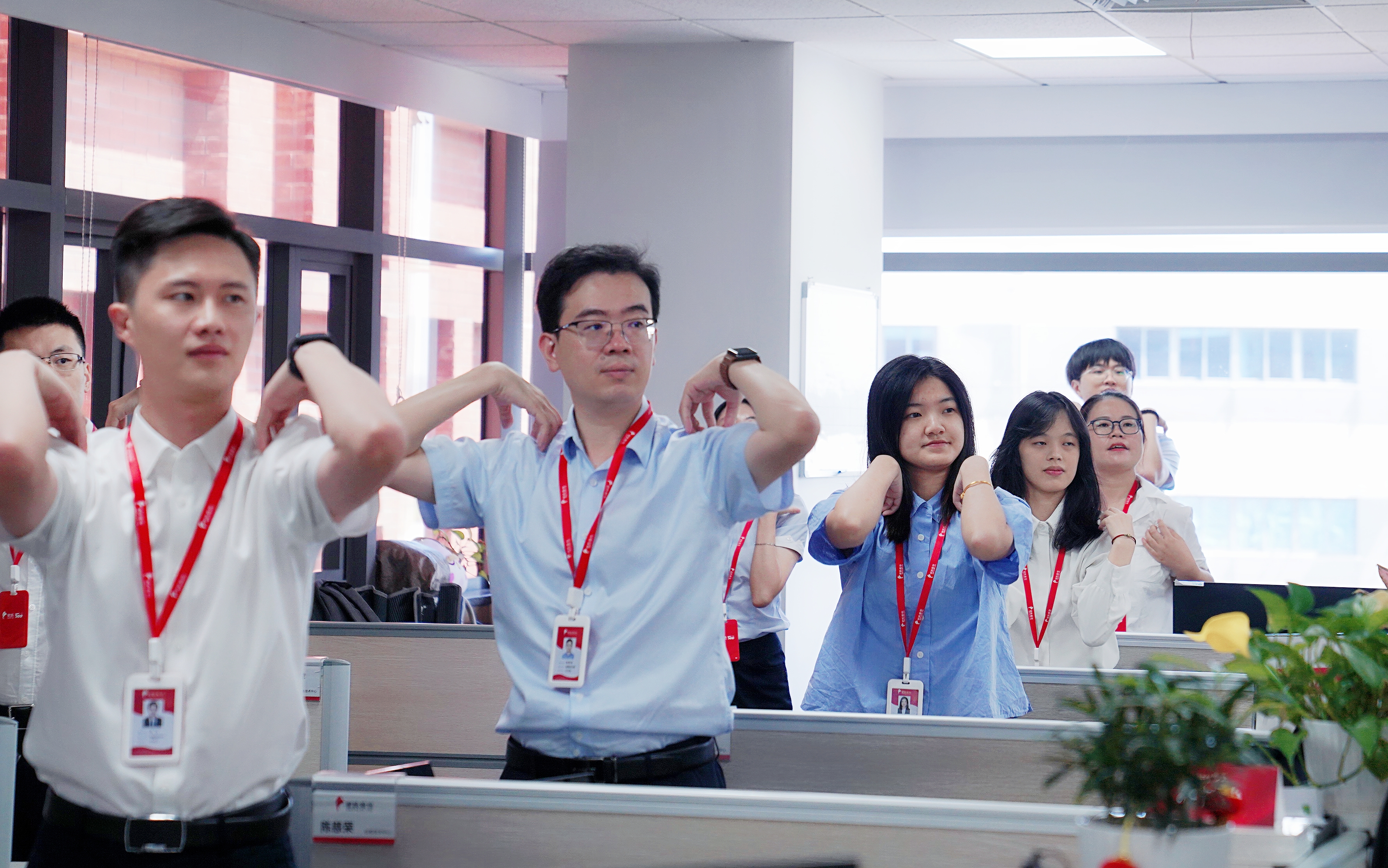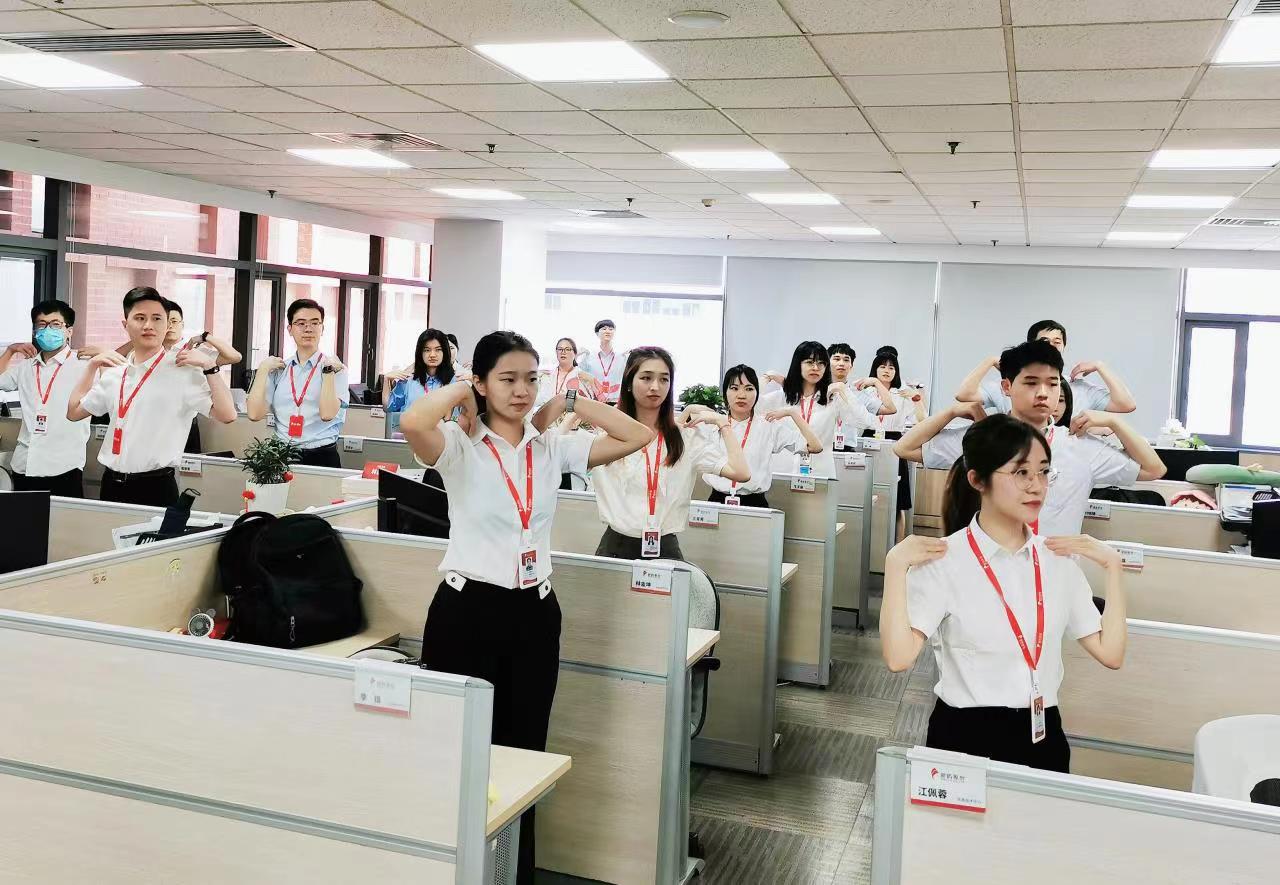 早上十點(diǎn)半,隨著律動(dòng)音樂的響起,大家紛紛從工位上起身,加入到了活力工間操隊(duì)伍中。一二三四,五六七八,二二三四,五六七八……頭部運(yùn)動(dòng)、體側(cè)運(yùn)動(dòng)、擴(kuò)胸運(yùn)動(dòng)、體轉(zhuǎn)運(yùn)動(dòng)……每一個(gè)節(jié)拍,每一個(gè)動(dòng)作,無不體現(xiàn)著象嶼人的朝氣蓬勃和積極向上!