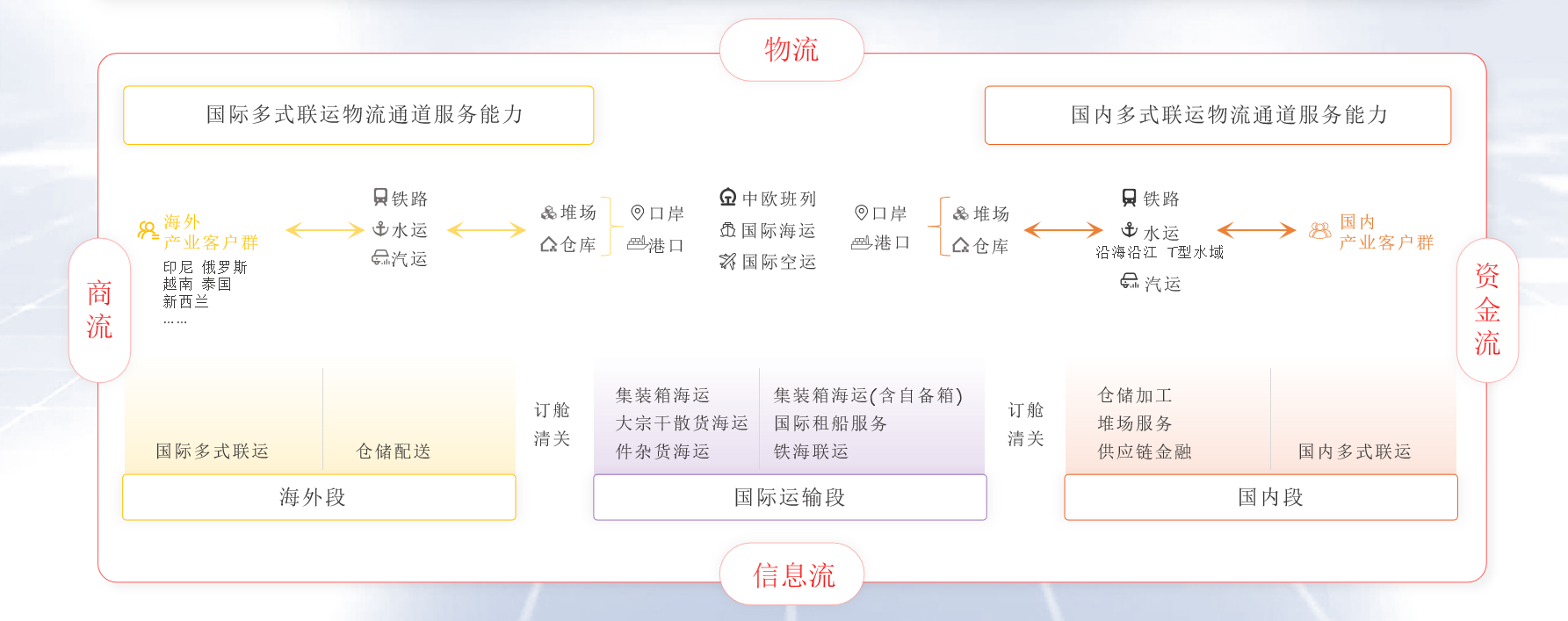 象嶼股份率先構(gòu)建了以“公、鐵、水、倉(cāng)”為支撐,覆蓋全國(guó)、連接海外的網(wǎng)絡(luò)化物流服務(wù)體系,并以“鐵、水”做干線、公路做兩端的經(jīng)營(yíng)思路,為客戶提供定制化多式聯(lián)運(yùn)解決方案,實(shí)現(xiàn)一站式門到門運(yùn)輸。目前,公司已經(jīng)打造出“北糧南運(yùn)”“鋁產(chǎn)品跨省流通”“北煤南運(yùn)”等多條多式聯(lián)運(yùn)物流線路。